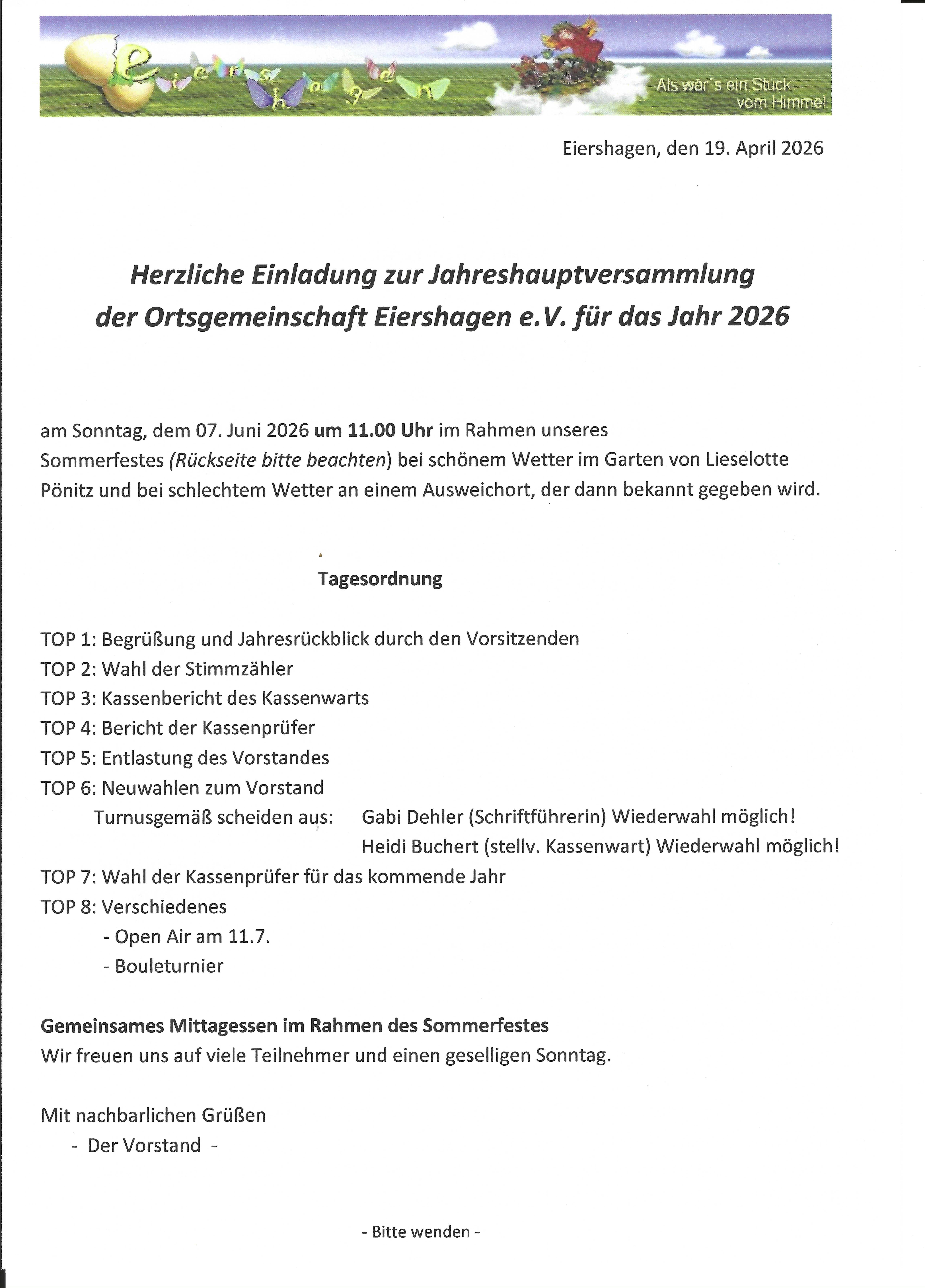 7.6. 11.00h Mitgliederversammlung + Sommerfest